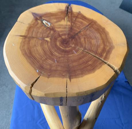 I have this handmade Rustic Red Cedar 3 Leg Stool, 18"tall x 11"wide x 3" Slab Top, 16"Log Legs rustic stool or plant stand. My price is $25, will meet at Meijers on Wilder Rd. and cash in person...