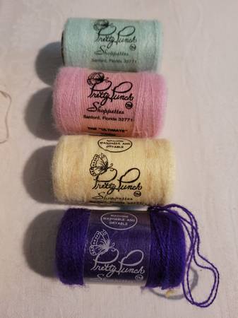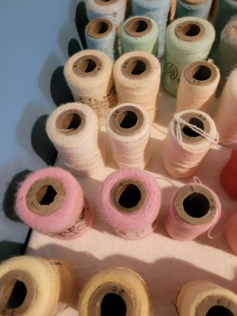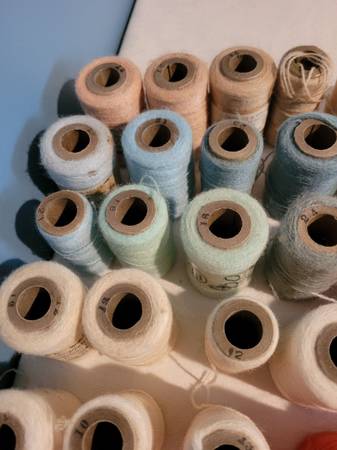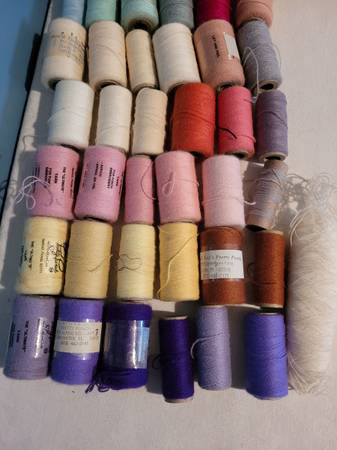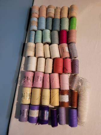 49 Embroidery Yarns, some have discoloring, see pictures for information and any imperfections. New and Used Bx stacked