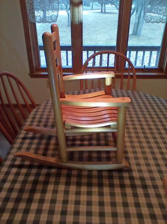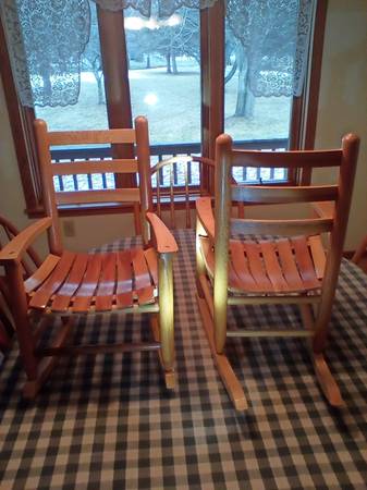 Two kids ladder back rocking chairs. Made by Builtright Chair Company. Well made and sturdy.