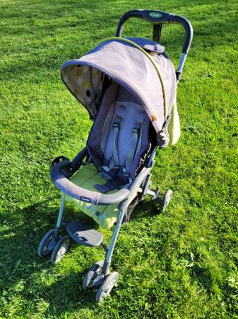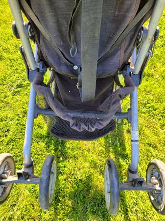 Baby Stroller by Combi, all wheels roll good. Can fold up flat or can fold more and lock as seen in picture. Has carrying strap for over the shoulder. Used