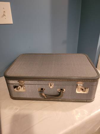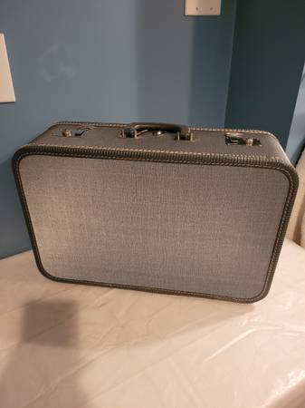 Vintage 50's Hard Shell Suitcase with key, grey. Measures about 13 3/4" wide x 21 1/4" long x 7" tall. Never used, been sitting in a box. Zipper works on pocket, elastic on pockets has deteriorated. See pictures for information and any imperfections. New