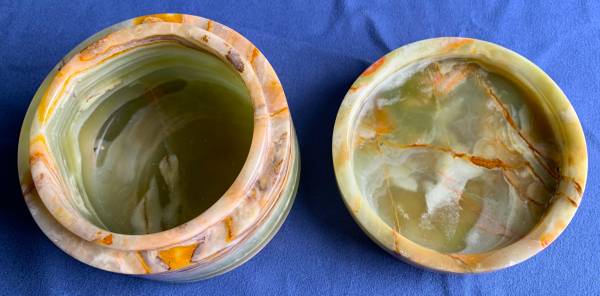 Large Green Onyx Crystal Rock Carved Jar from Pakistan 4"x 2-1/2", in great condition no chips or cracks with thick walls and lid. My price is $50, will meet at Meijers on Wilder Rd. and cash in...