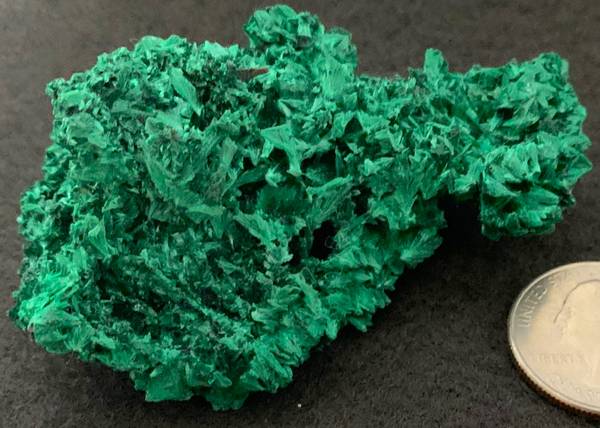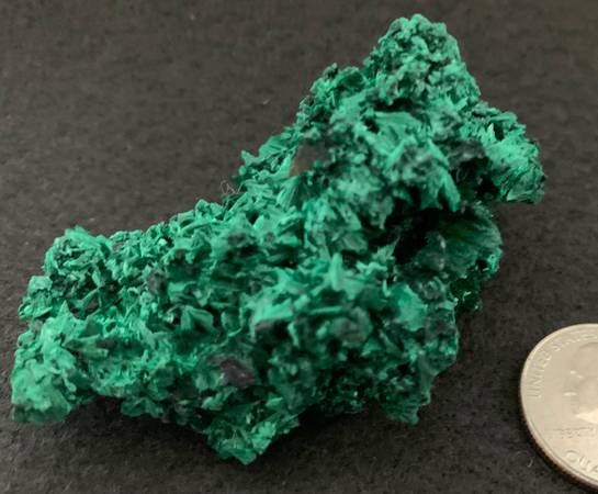 Beautiful Natural Green Malachite Crystal Rock from Africa display piece. Size is about 2"x3"x1" thick, see the quarter in pics. Paid $35 years ago, my price is $20, will meet at Meijers on Wilder Rd. and cash in person only. No shipping or money orders, checks.