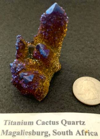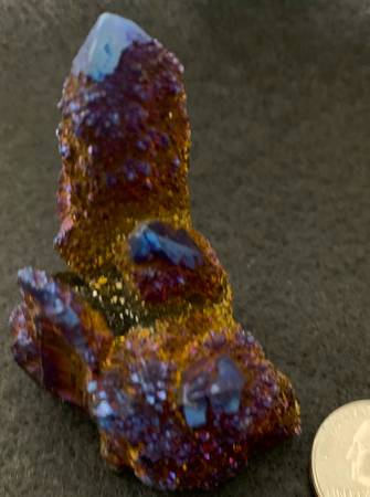 Rainbow Titanium Aura on Quartz crystal rock display piece. Size is about 2"x2-1/2" tall, see the quarter in pics. Paid $45 years ago, my price is $35, will meet at Meijers on Wilder Rd. and cash in...
