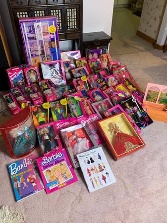 Collection of fifty (50) Barbie dolls, books, sets and vehicle. All new in-box and unopened. Asking $2,000.00 for the entire set (approximate value based on individual items on eBay would be over $3,500.00). Available for pickup only. Red and Green Holiday Barbies, Barbie Rockers (DANA), Barbie Rockers (KEN), Jewel Secrets Barbie (3 versions), Air Force Barbie, Barbie Rockers (Barbie), Dream Glow Barbie, Tropical (Miko), Tropical (Ken), Barbie Rockers (DEE DEE), Barbie Rockers (DIVA), Army Barbie, Marine Corps Barbie, Super Hair Barbie, Tennis Barbie, Barbie Rockers (DEREK), Astronaut Barbie, Gift Giving Barbie, Funtime Bar bies (2 versions), Jewel Secrets (Ken), Celebration Barbie, Jewel Secrets (Whitney), My First Barbie, Barbie underwear and leggings, Barbie Furnished Townhouse, Ballerina Barbie, Southern Belle Barbie, Magic Moves Barbie, Horse Lovin' Barbie, Horse Lovin' Ken, Tropical Skipper, Fun-To-Dress Barbie, Riviera Motor Scooter, Miniature Barbie, Barbie - Her Life & Times by BILLLYBOY, Smithsonian Barbie Catalog, Barbie Sticker Album, Barbie Bathroom set. Selling as a set, not individually. Would make a fantastic Christmas gift!