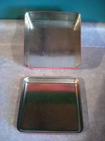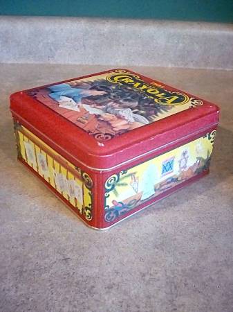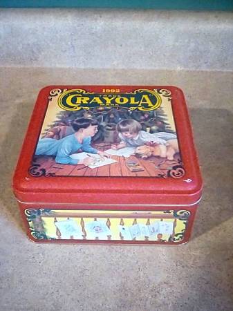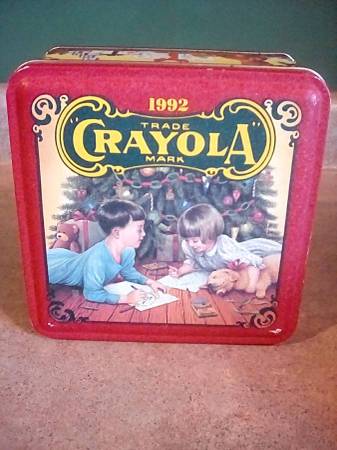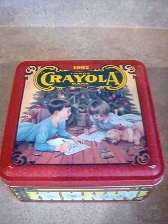 1992 Crayola Holiday Tin, measures about 6" wide x 6" long x 3" tall. Little paint scuffed off, minor scuff marks, one small dent on lid.