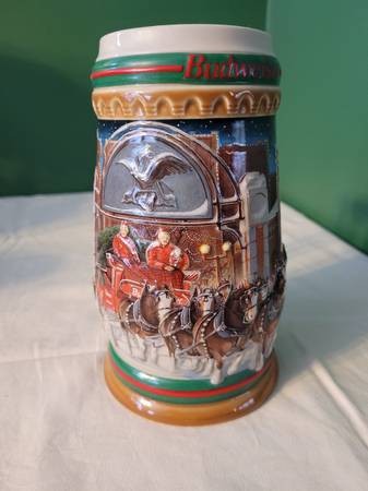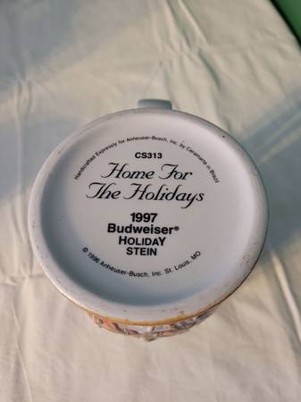 1997 Budweiser Stein, CS313, measures about 4" across x 7" tall. Home for the holidays, no cracks or chips. Used