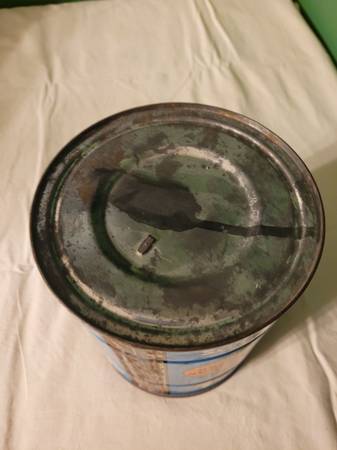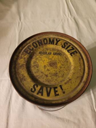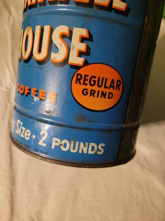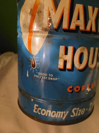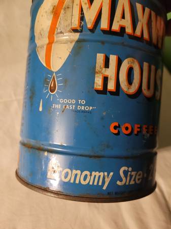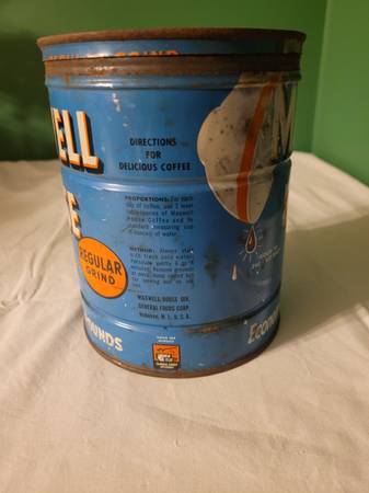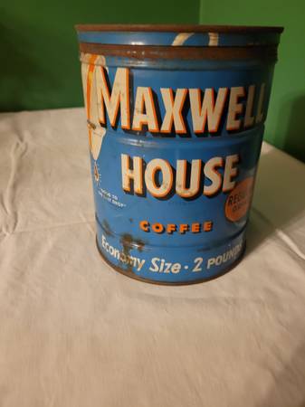 Maxwell House Coffee Can, measures about 5" across x 6 1/2" tall. Says economy size, 2 pounds, regular grind, general foods. Surface rust. Used