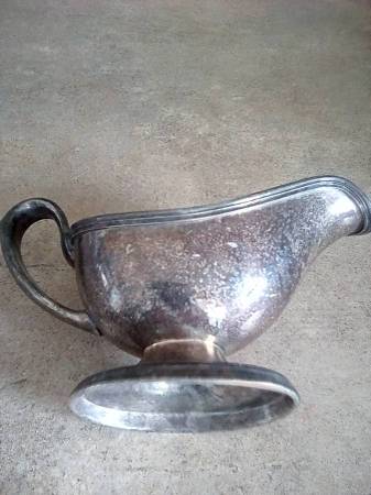 Vintage Gravy Bowl With Handle, measures about 3 1\2" wide x 7 1\2" long x 4 1\2" tall. No cracks or dents, tarnished.
