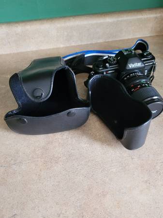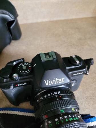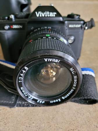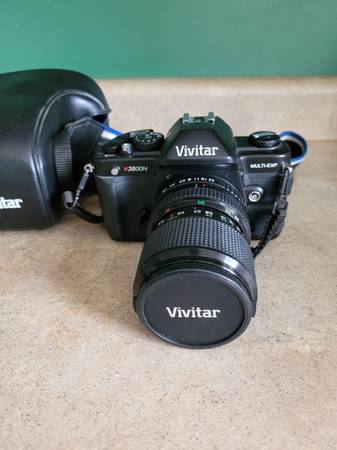 Vintage Vivitar 3800N 35mm Camera. Multi-Exp, Macro focusing zoom, 28-70mm, 1:3.4-4.8. All levers and buttons work good, minor scuff marks. Case isnt in perfect condition. Untested with film. Used