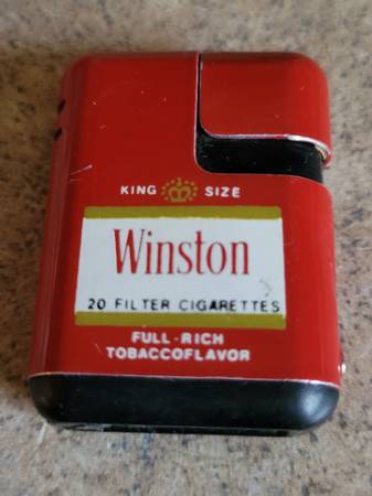 Vintage Winston Lighter, measures about 1 1/8" wide x 1 1/2" tall. Sticker on bottom says liter. Has scuff marks see pictures. Does have spark when you push lever. Untested with fuel. Used