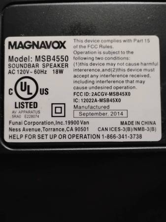Magnavox soundbar, has a universal remote blue tooth capable, hardly used works as should, only issue is wire had to be taped. Does not effect the sound. Pick up or drop off serious inquires only