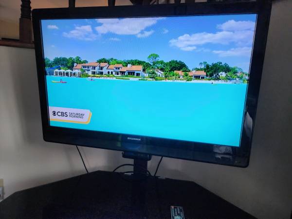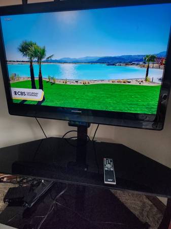 42 inch TV plus stand with two glass shelves. Television has 3 HDMI ports, a USB port and AV hook-up. Remote included. Cash Only