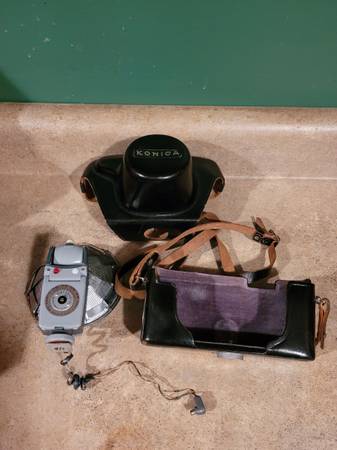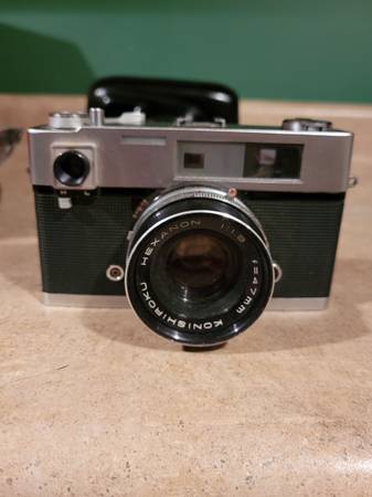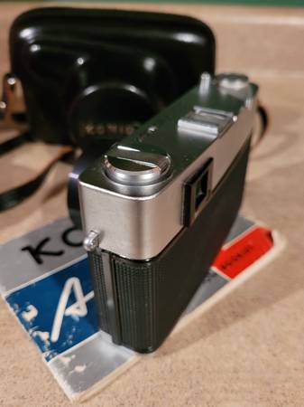 Konica Auto S Camera with collapsible flash unit. All levers and buttons work on camera, untested with film. Collapsible flash unit is untested, no batteries included. Minor scuff marks, case not in perfect condition, see all pictures for condition of everything. Used