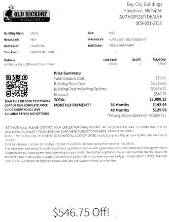 We are a NEW authorized Old Hickory shed dealer located on M25 just 9 miles east of Bay City (Quanicassee). We have many different models and options on the lot, come check them out at 9006 Bay City Forestville Rd. Fairgrove, Mi 48733. M25 ParknSell Call or text Rock show contact info