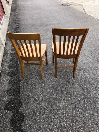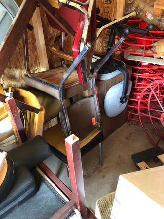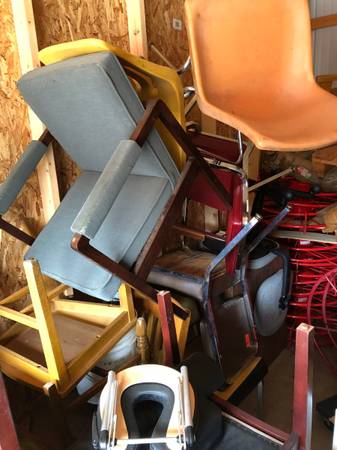 Have for sale different styles of chairs. Have sets of 2's wooden chairs $15.00 for the pair. Have other single wooden chairs at $5.00 each. Have several different color and style of metal frame...
