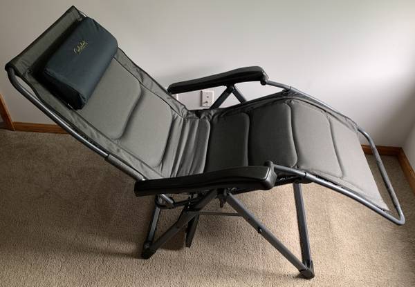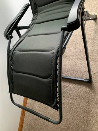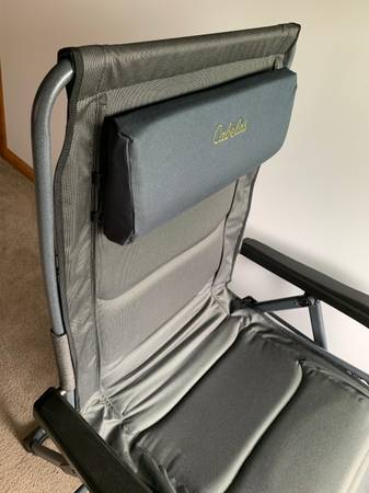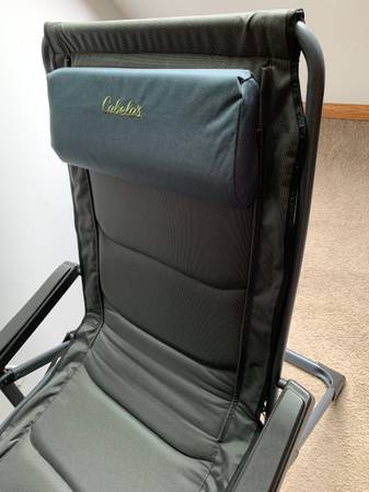 This is in new condition, and a very heavy duty chair, the Big Outdoorsman Lounger Chair, it's multi-position design adjusts to let you sit up straight, lay down flat, and enjoy many positions in-between, the chair features the popular bungee suspension system, camping chair has an adjustable pillow at the head area and a layer of thick foam padding across the back and seat areas. It has a slide-out table with electronic device holder to keep your drink, phone, chair has an strong and stable frame that's made of steel with a powder-coated finish. Heavy-duty, 600-denier, polyester fabric is water-resistant. Open: 45"H x 31.5"W x 22"D - Folded: 38.2"L x 5.5"W x 32.1"H - Weight: 25.3 lbs. Max Wt. Cap.: 400 lbs. They are $130 new plus tax, my price is $115, will meet at Meijers on Wilder Rd. and cash in person only. No shipping or money orders, checks.