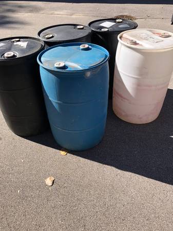 Selling plastic barrels. Size is 55 gallons. In good use able shape. Have 4 for sale. Asking $20.00 each. Call or text. Number . SORRY due to all the spam emails NO NO email answered without phone...