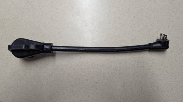 Up for sale is a never-used adapter for RVs. It allows you to connect a NEMA 14-50 plug into a standard outlet. The adapter is a little more than 1 foot in length, and the cord is 10 gauge rated for 30A at up to 600V.