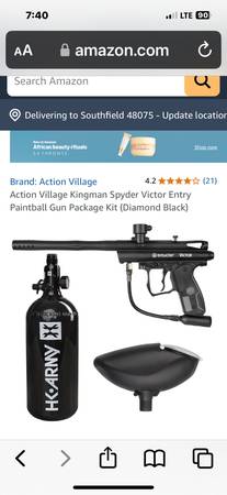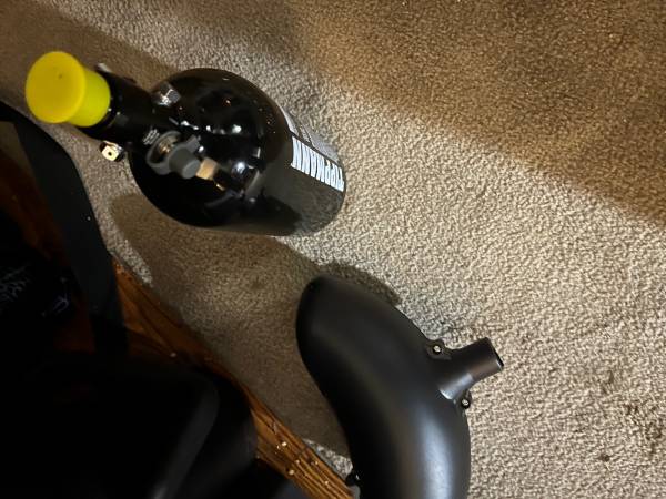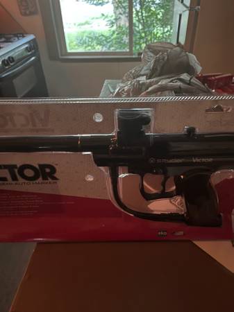 Spider victor black gloss paintball gun brand new in sealed package with a co2 storage tank and hopper the tank is for refilling to heavy for attaching to gun. I paid 126.00 got a different gun.