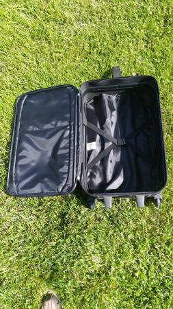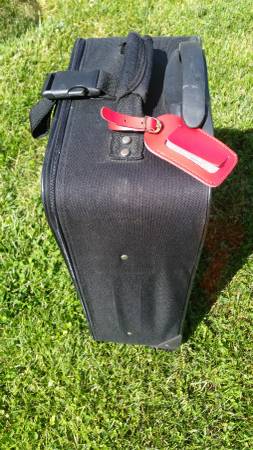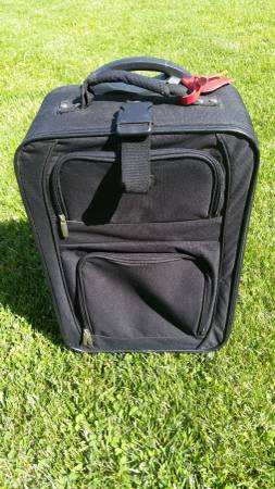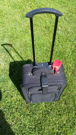 Suitcase soft, black, measures about 13 3/4" wide x 22 1/2" long x 7 1/2" deep. Has wheels and pull out handle, all zippers work.