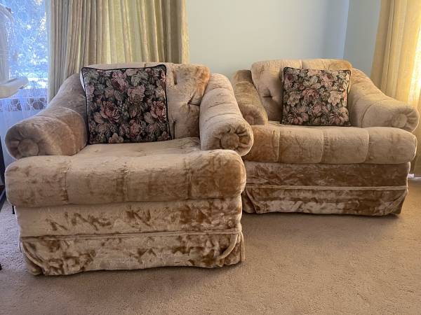Beige crushed velour sofa - three cushions are removable and each have a zipper. Two matching chairs - cushions are removable and have a zipper. 39" w x 36" deep x 29" h Floral pillows - only used...