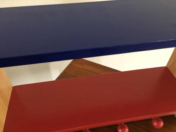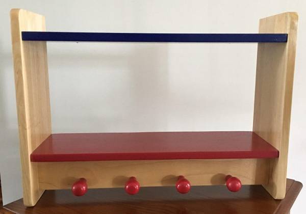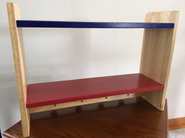 FOR SALE: Adorable shelf perhaps for child's room. Beautiful condition. Smooth solid wood. 13.5" tall; 19" long; 5 and 13/16" deep. Heavier than it looks. (Midland County)