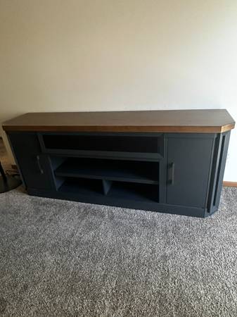 Bought brand new in November 2024 - never used it. Has a hidden soundbar shelf with an acoustic sound cover. 2 cabinets (one of each side of the unit with a shelf). Really heavy...will need 2 people to move it. Walnut top with navy blue bottom.
