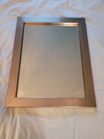 Mirror, brush nickle frame, measures about 22" wide x 28" tall. Used