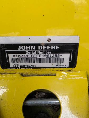 John Deere snow plow, 44" wide, for model 530 tractor, may fit on 300 and 500 series also. Control mechanism for angle contol frm seat. In good condition. No email, or text, CALLS ONLY to Don at .