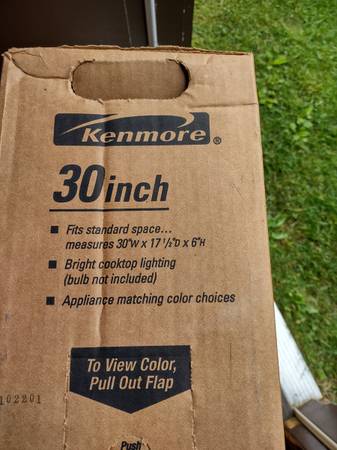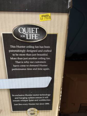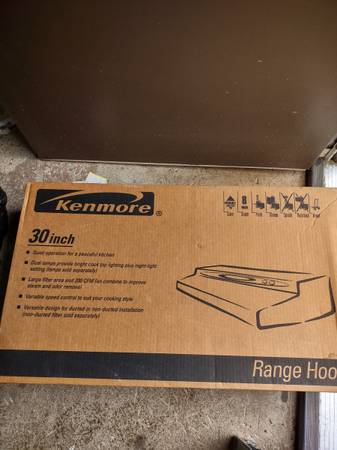 Two new white ceiling fans - 52 inch, no light; Black Range Hood with light and fan, 30"x 17.5 x 6" New.
