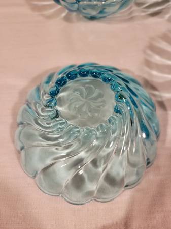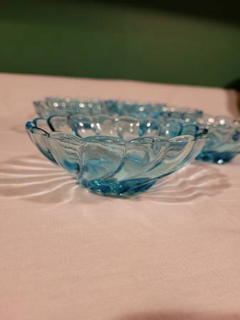 6 Blue Dessert Bowls, measure about 4 3/4" across x 1 3/4" tall. No cracks or chips. Used