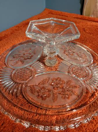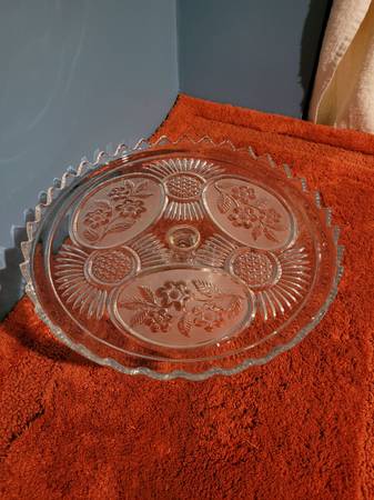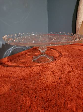 Cake Stand, measures about 12 3/4" across x 4 3/4" tall. There are 2 small chips. See pictures for information and any imperfections. Used