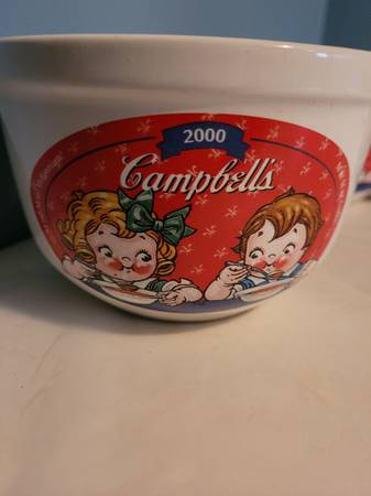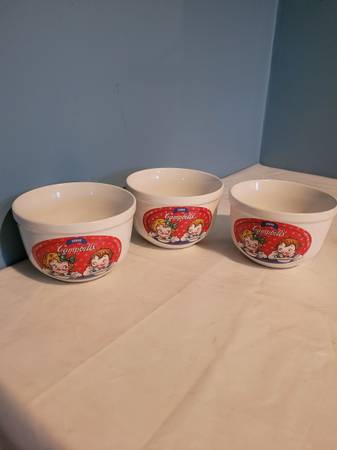 3 Campbell's Soup Bowls, measures about 5 1/2" across x 3 1/2" tall. See pictures for information and any imperfections. Used Bx77