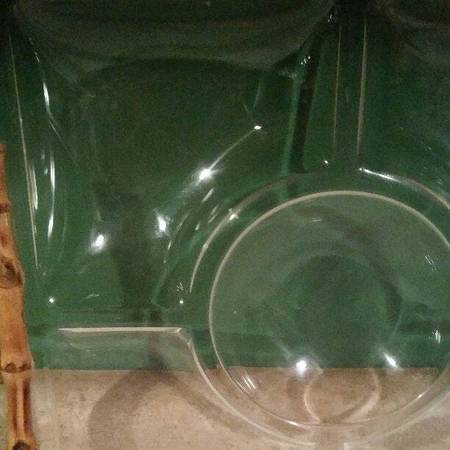 Divided Serving Tray Clear Plastic with wood handles, measures about 12 1/2" wide x 11 3/4" long. 5 divided sections, minor scuff marks, no cracks. Used I do ship, buyer pays shipping cost.