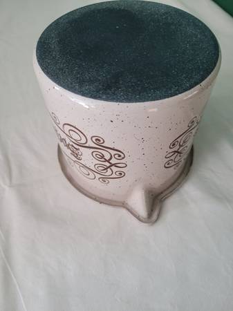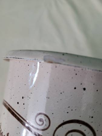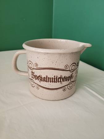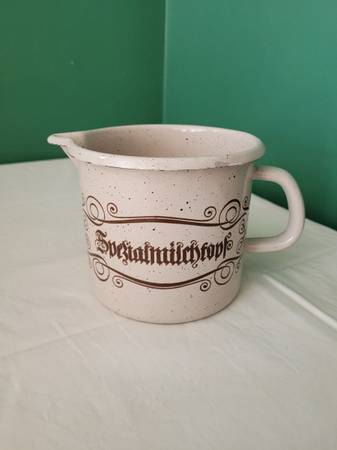 Enamel Gravy Boat, measures about 5 1/4" across x 4 1/2" tall, has minor nicks and discoloring see pictures. Used