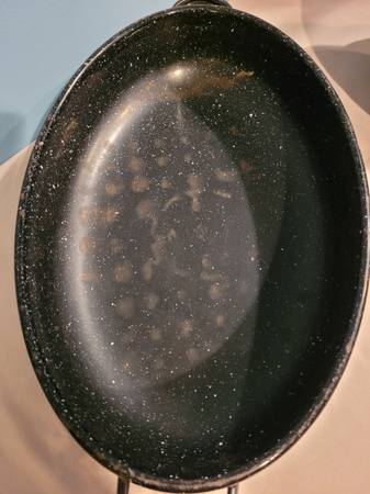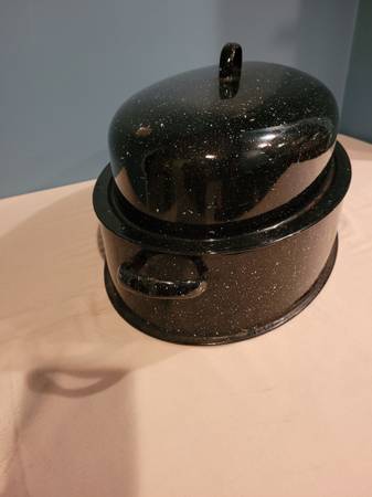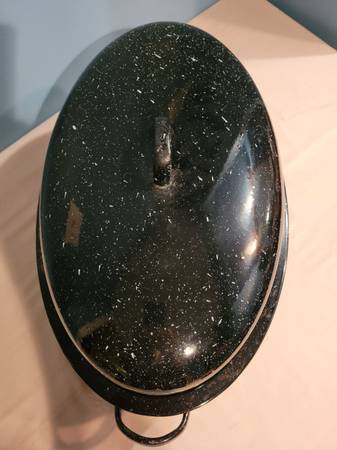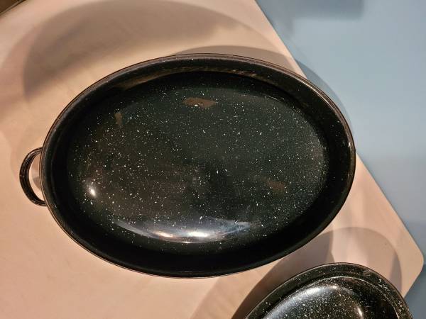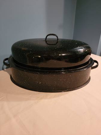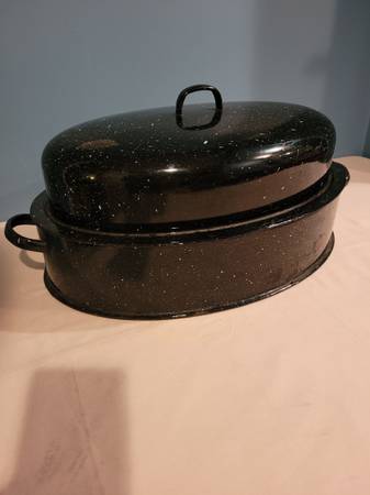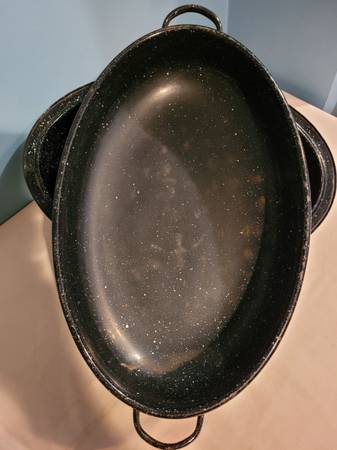 Enamel Roasting Pan, measures about 13 1/4" wide x 17 1/4" long x 8" tall. I do ship, buyer pays shipping cost.