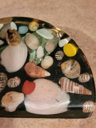 Pen Holder Or Paper Weight with sea horse and sea shells. Measures about 3 1/2" wide x 5 1/4" long x 1 1/4" tall. Felt padded bottom, has minor scratch and nicks, molding lines see pictures. Pen not...