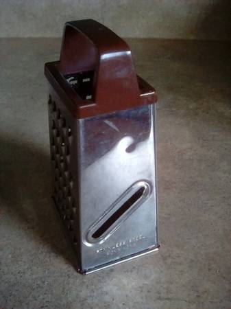 Small Cheese Grater, Shredder, stainless steel, measures about 2 1\4" wide x 3 1 \4" long x 5 3\4" tall. Plastic handle.