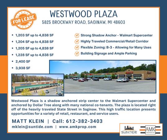 Westwood Plaza is a shadow anchored strip center to the Walmart Supercenter and is anchored by Dollar Tree along with many national co-tenants. The plaza is located right off of the heavily traveled State Street in Saginaw. This high traffic location presents opportunities for a variety of retail, restaurant, and service users.