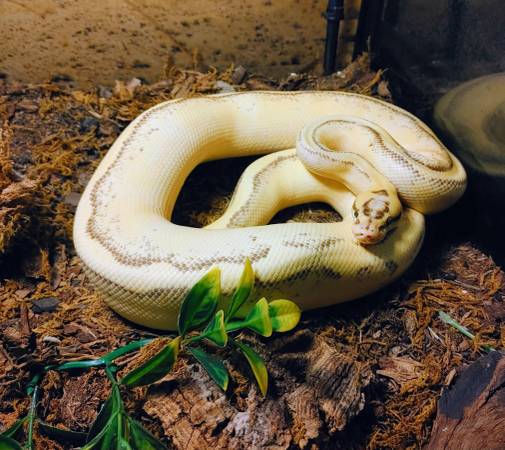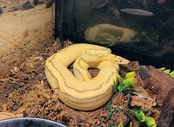 This handsome boy needs a new home --through no fault of his own. He's around 3 years old, confirmed male by the breeder (Responding Reptiles) and eats like a champ. He's friendly, enjoys exploring from around your shoulders and likes to burrow into blankets. He is currently eating a medium f/t rat every 14 days. Please feel free to reach out with any questions, I'm willing to take offers. No enclosure included, though I can offer his heating lamp and bulb, along with his cage decor and the Zilla double UVB lights.