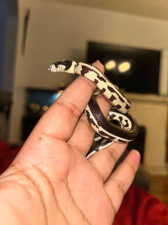 Currently on fuzzies. Gender unknown. Typical Kingsnake personality. Reverse stripe w high white and spot mutation. We’re moving soon and I decided kingsnakes weren’t my thing anyway lol. Small fee...