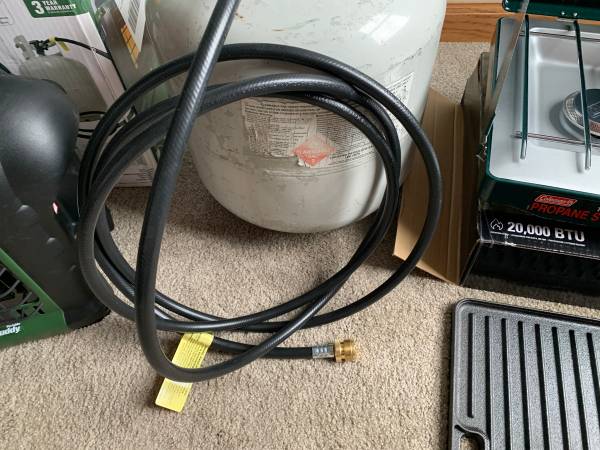New and unused with boxes this Coleman 2 Burner Camping Stove, new are $100, with a unused griddle plate, $20 new. Full 20 lb propane tank with new 6 ft hose, new $30. Mr. Heater Buddy Heater, swivel regulator gives you the ability to adapt usage from a disposable cylinder to a remote 20 lb. gas cylinder with the purchase of a hose and filter. Oxygen Depletion Sensor and accidental tip-over safety shut-off help ensure safe use of the portable heater, emits 4,000 or 9,000 BTU/hr radiant heat, heats up to approximately 225 sqft. 2 temperature settings: low and high, runs 5.4 hours on low and 2.4 hours on high with 1 lb propane cylinder, new this is $130. My price is $300, will meet at Meijers on Wilder Rd. and cash in person only. No shipping or money orders, checks.
