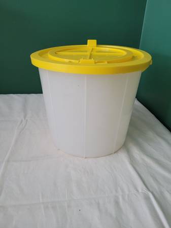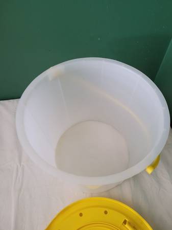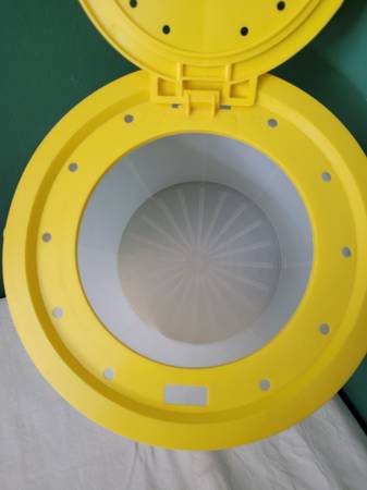 Plastic Minnow Bucket, measures about 8 3/4" across x 7 1/4" tall. Push tab to open, pull tab to lock. No cracks or breaks. Used Bx big box