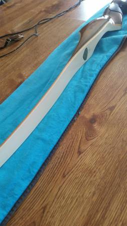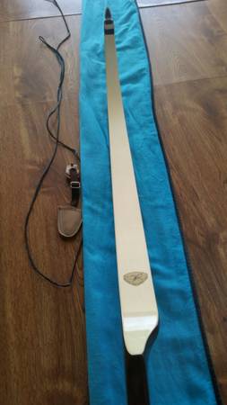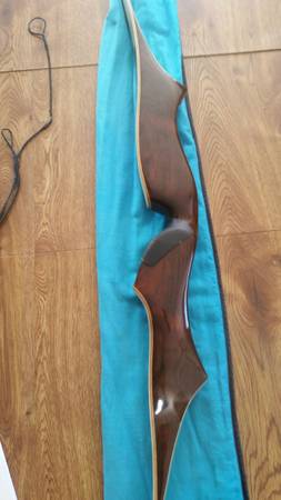 Vintage Recurve RH Swift Wing Bow, 66" and 37#, S-2411, has string which isnt fryed and leather finger, cloth cover, has nock on string, black rubber is worn a bit. Above where the pound, length, serial number is, there is a little discolor from a persons name that was removed who owned it, minor scuff marks. Used