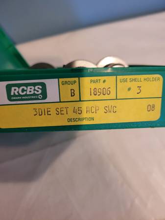 RCBS Die Set 45 HCP SWC, in great condition. See pictures for information and any imperfections. Used Bx74