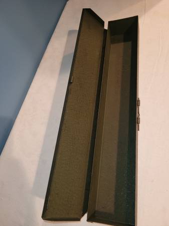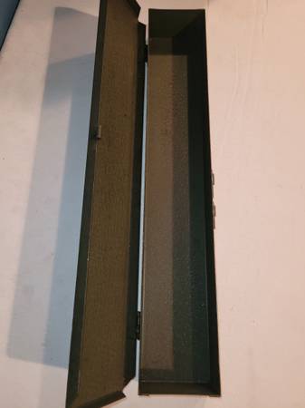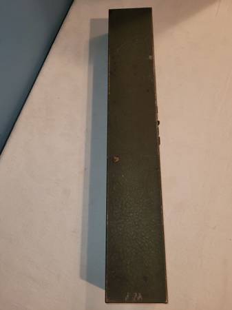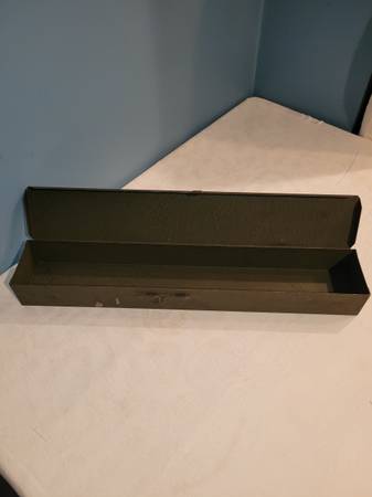 Tool Box, measures about 3 1/4" wide x 18 1/2" long x 2 1/8" tall. It's an army green color. See pictures for information and any imperfections. Used Bx86