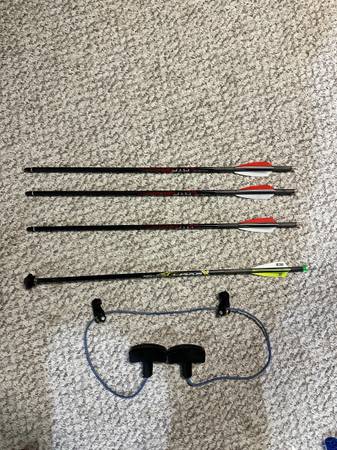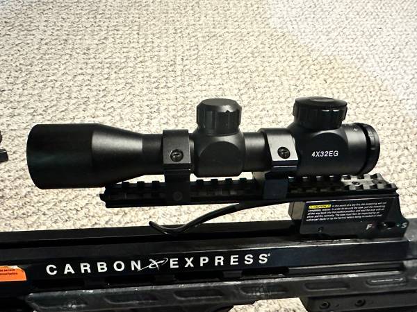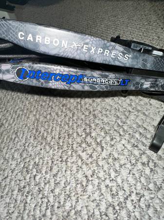 Carbon Express Intercept Supercoil LT Crossbow. Includes case, 4x32 lighted scope, 3 lighted knock bolts, discharge bolt, cocking string. $150.